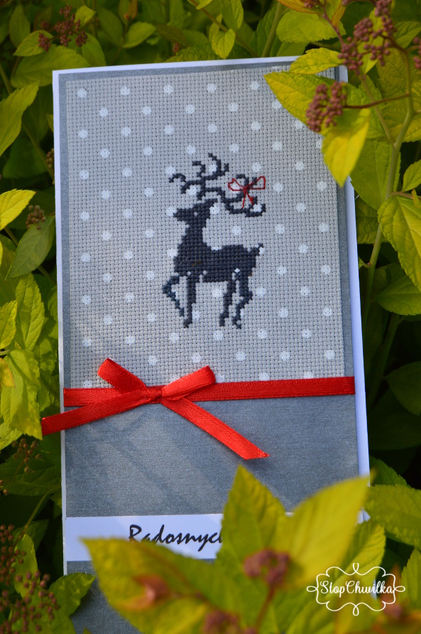 Tak więc na "zajączkowej" kartce plamki kleju trwale się zalogowały i efekt końcowy psują, a na "reniferkowej" niteczki kanwy nieco krzywo się poukładały.
