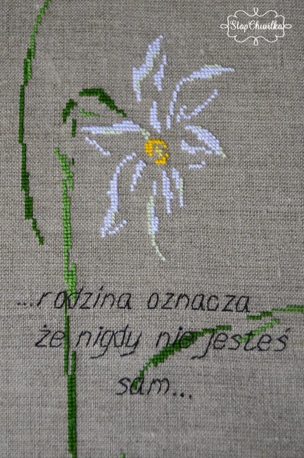 takie motto wyhaftowałam na pamiątkę pewnego rodzinnego spotkania.Słowa czarną nitką haftowane z białym narcyzem w tle, dość wiernie oddają sens tego przekazu.